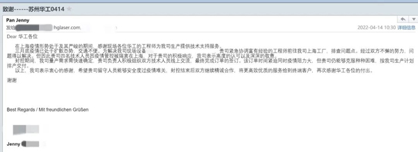 近期,全國(guó)多省份、多起疫情同時(shí)發(fā)生,牽動(dòng)人心。華工激光在特殊時(shí)期仍保持著高效優(yōu)質(zhì)的服務(wù),一封封來自各地客戶的感謝信是客戶對(duì)我們的贊許與肯定!